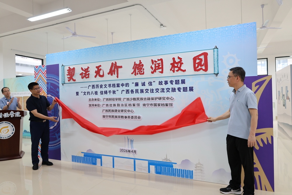 本报讯(记者 杨兰桂 通讯员 方维荣)4月28日,广西财经学院携手自治区少数民族古籍保护研究中心共建的我区首家民族地区财经历史文书专题展馆正式揭牌亮相,同步开启双主题特色展览,为学校文化育人、铸魂育人搭建全新特色阵地。自治区纪委监委驻广西财经学院纪检监察组组长谢立平、自治区少数民族古籍保护研究中心主任韦如柱共同为展馆揭牌,多家区内相关单位嘉宾与学校师生代表共同见证本次育人建设成果落地。