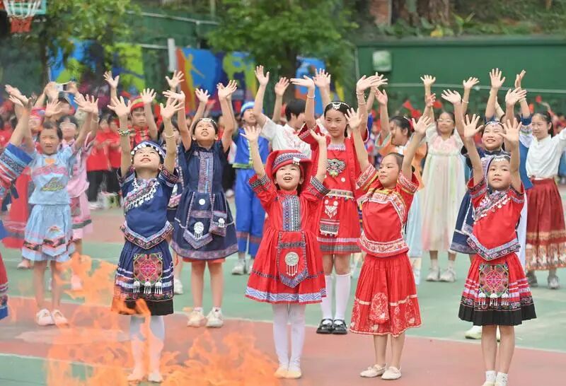 ▲4月16日,在广西梧州市龙圩中心小学集团举行的“三月三”民族团结主题实践活动中,小学生们在跳篝火舞。新华社记者 黄孝邦 摄